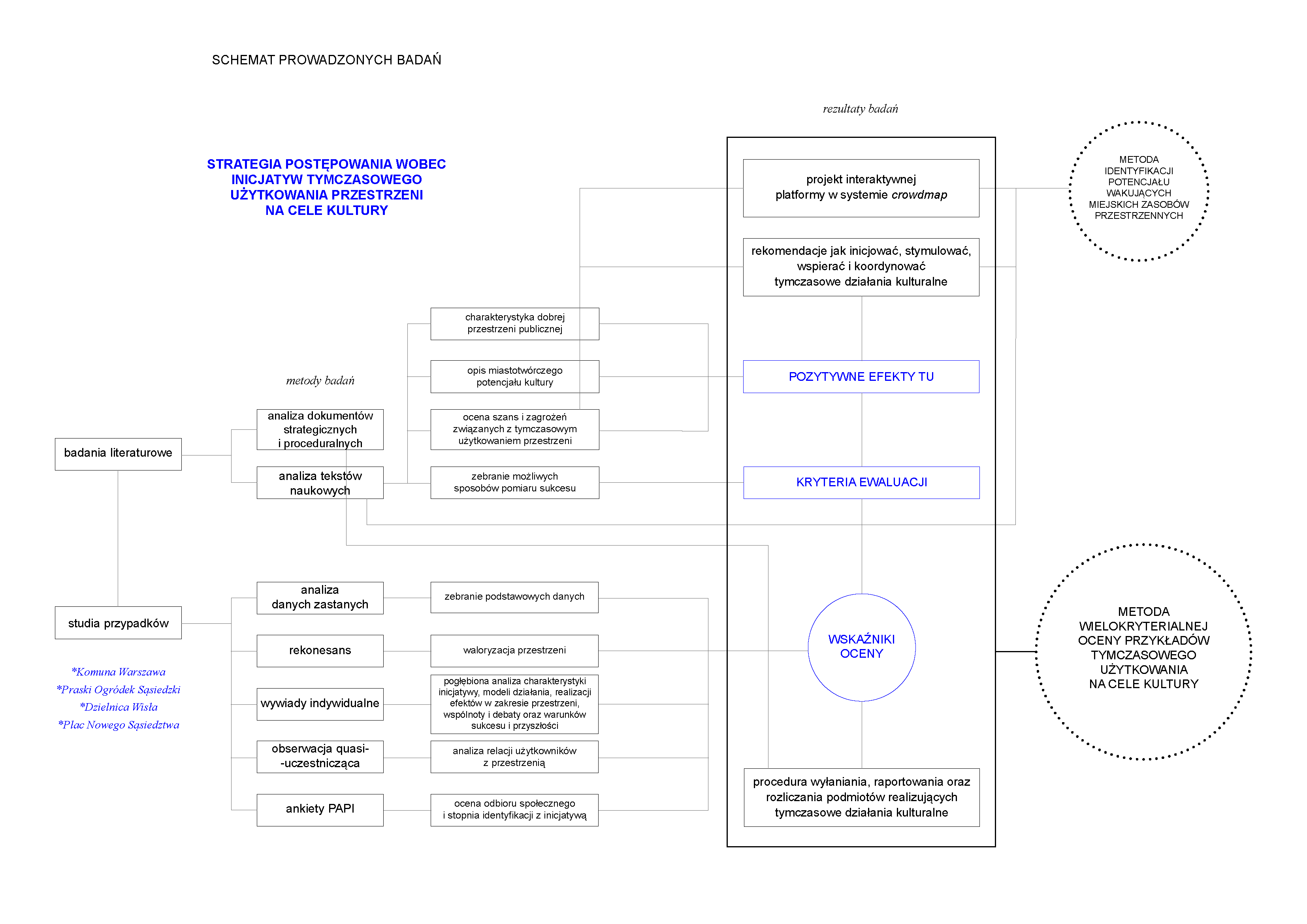 Celem stypendialnego projektu badawczego była pogłębiona analiza zjawiska tymczasowego użytkowania przestrzeni na cele kultury oraz wynikająca z niej metoda oceny dopasowana do zróżnicowanych działań i efektów. By to osiągnąć przeprowadzono badania literaturowe oraz dokonano analizy czterech warszawskich inicjatyw tymczasowego użytkowania. Pozwoliło to na stworzenie Metody wielokryterialnej oceny, w ramach której opisano pozytywne oczekiwane efekty oraz kryteria i wskaźniki ewaluacji. Propozycją wdrożenia rezultatów badań są hybrydowe procedury administracyjne, rekomendacje dla samorządów oraz interaktywna platforma mapowania partycypacyjnego.